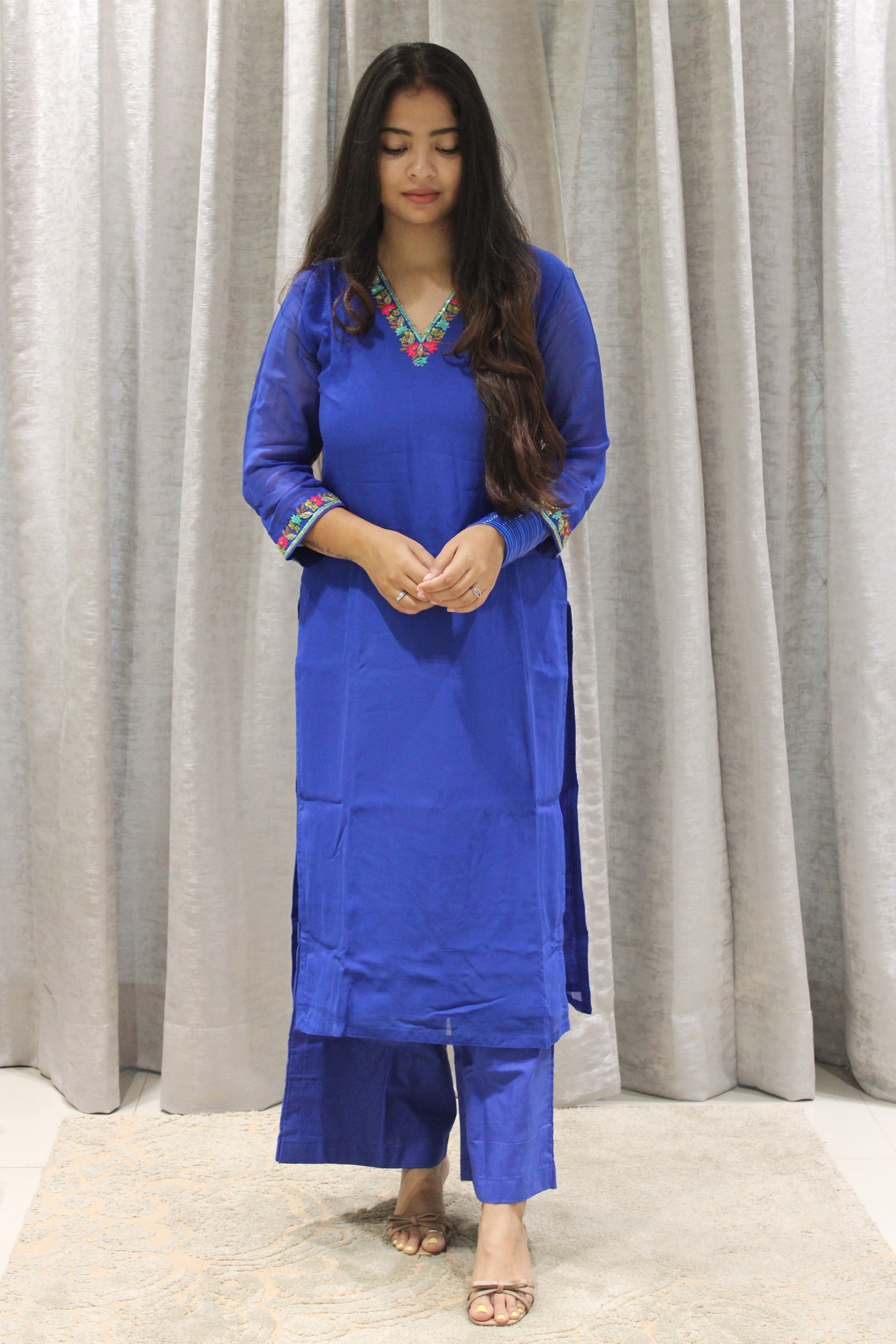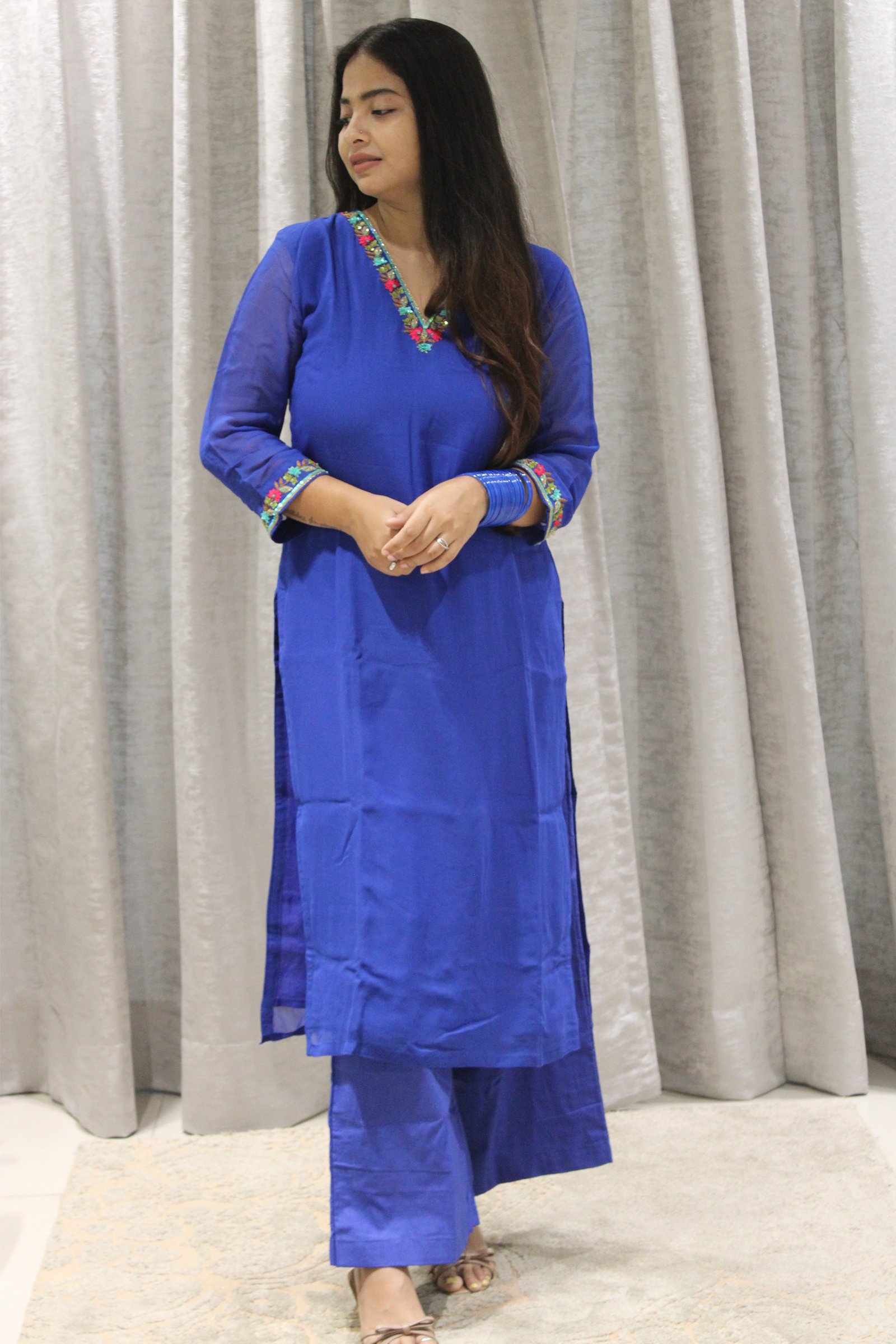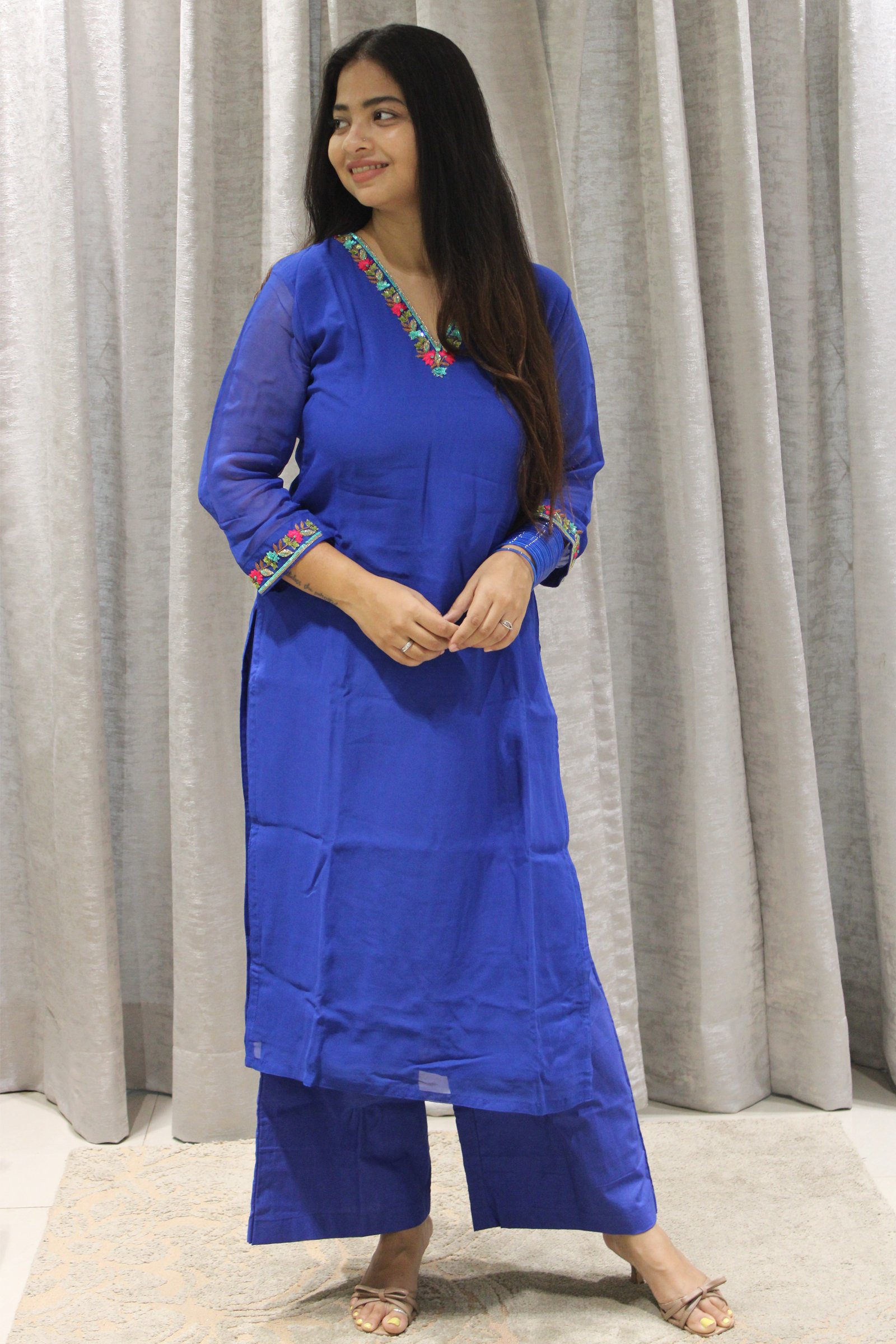 The Georgette, known for its light and flowy texture, provides an airy and elegant feel, making it perfect for both casual and formal occasions. The hand-embroidered floral thread work on the neckline and sleeves, crafted by artisans, adds a delicate and beautiful touch to the kurta, enhancing its appeal. The floral embroidery brings a refreshing and feminine vibe to the set, and the intricate work on the neckline and hands draws attention to the upper body, making it visually appealing. Paired with comfortable and stylish palazzo pants, this ensemble is both trendy and traditional, offering comfort while maintaining elegance. This kurta set would be ideal for a variety of occasions, from daytime events to semi-formal gatherings. Its light fabric and artisan embroidery make it a graceful choice for almost any season.